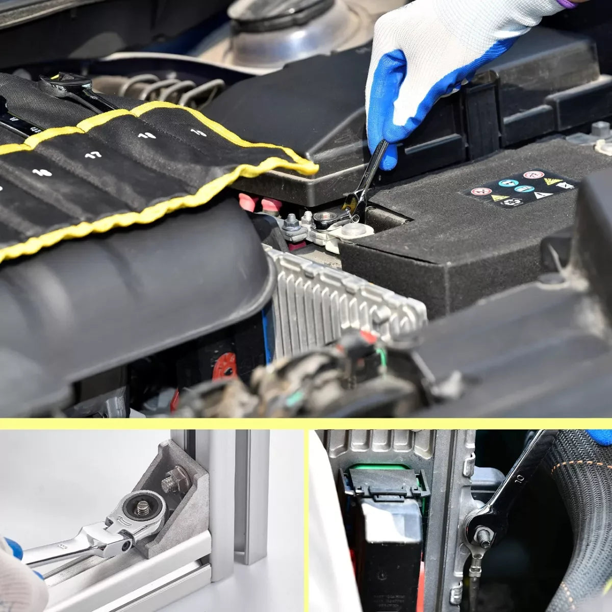 Discover exceptional versatility and durability with the 12/14/16/17pcs Flex-Head Ratchet Wrench Set by The Only Stop Shop 25. Crafted from premium Chromium-Vanadium steel, this professional-grade combination wrench set offers unparalleled strength and long-lasting performance for all your mechanical needs. The flex-head design ensures easy access to tight spaces, while the 72-tooth ratchet mechanism delivers smooth, precise operation with minimal effort.