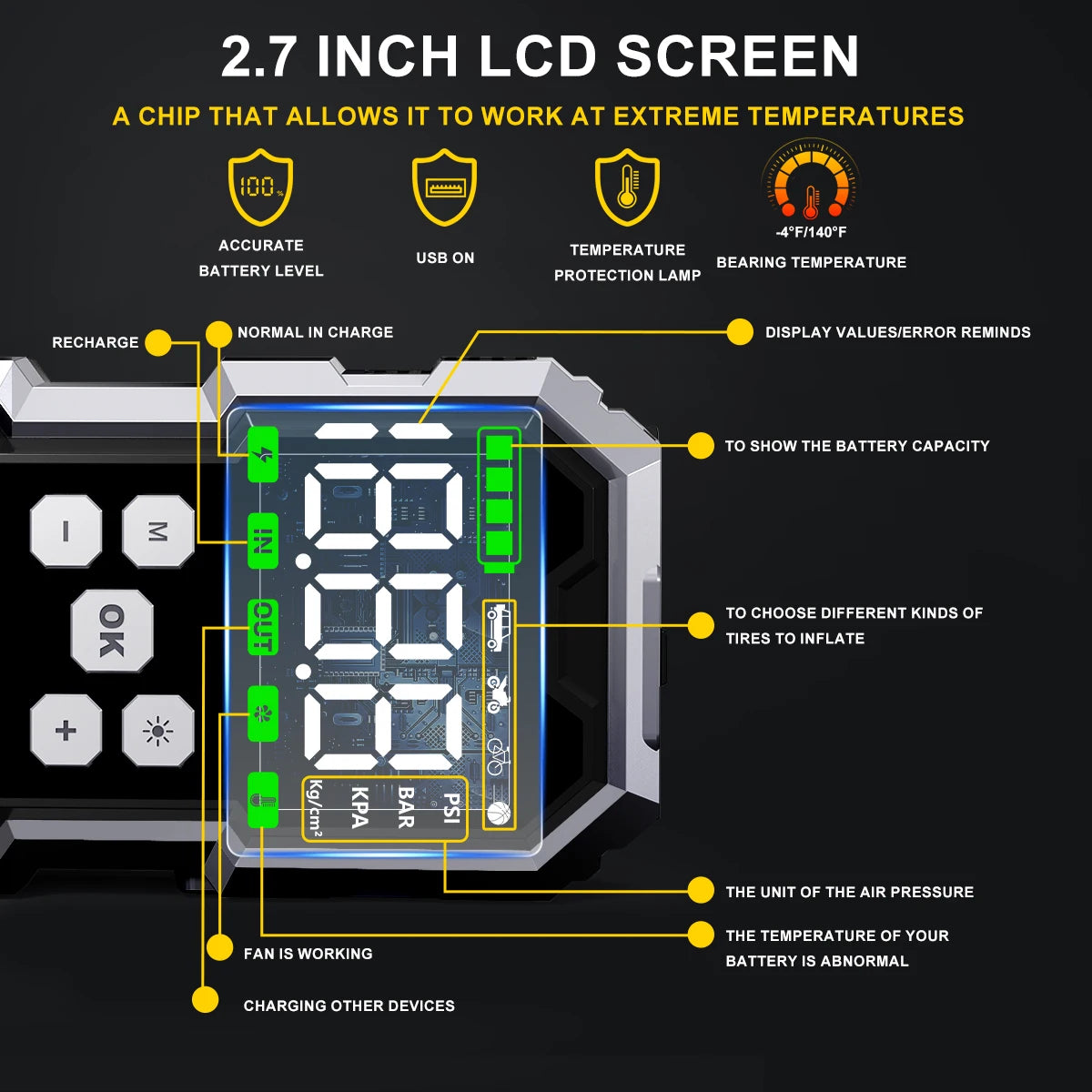 Power up with confidence using the Car Jump Starter With Air Compressor LCD Screen from The Only Stop Shop 25. This all-in-one portable booster combines high-capacity charging, emergency starting power, and a built-in air compressor to keep you moving during road trips, daily commutes, and roadside moments.
