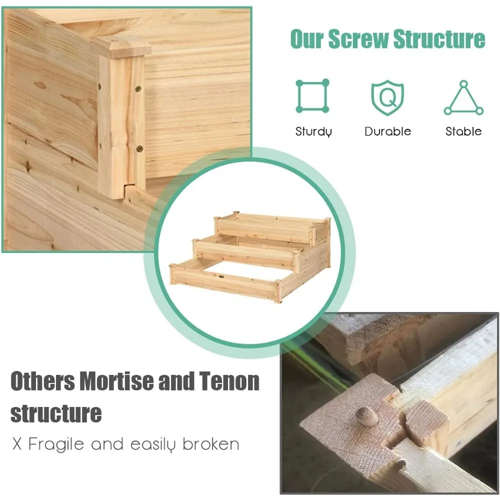 Crafted from high-quality, durable wood, this 3-tier raised garden bed ensures longevity and stability while offering an ideal growing environment for your plants. Its natural finish allows it to blend seamlessly into any outdoor setting, enhancing your garden's beauty without the need for chemical coatings.